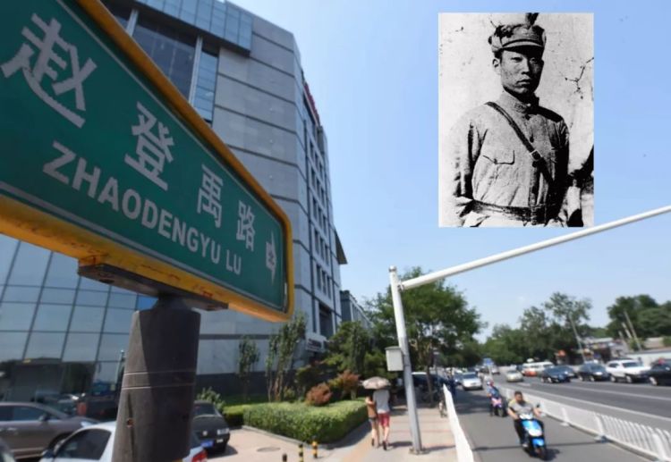 北京西城區趙登禹路,右上角為趙登禹像(拼版照片)。新華社記者 羅曉光 攝