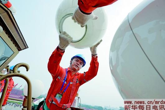 回憶起第一次清洗華燈,老人記憶猶新:那時沒有專門的車輛,只好借用其他單位的杉篙木架子,10米多高,上面鋪上木板。站上去晃晃悠悠,心里直打鼓。清洗一基華燈,得挪動三四次架子,每挪動一次,就得先下來、再爬上去。“第一天清洗,一個上午一基華燈都沒做完。”王慶余回憶道,當時把胳膊都伸進去也夠不著燈球的底部。