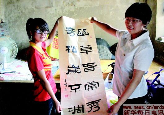 在“手拉手、共成長”活動中,石外學生向山區(qū)學校小伙伴贈送書法作品。受訪者供圖