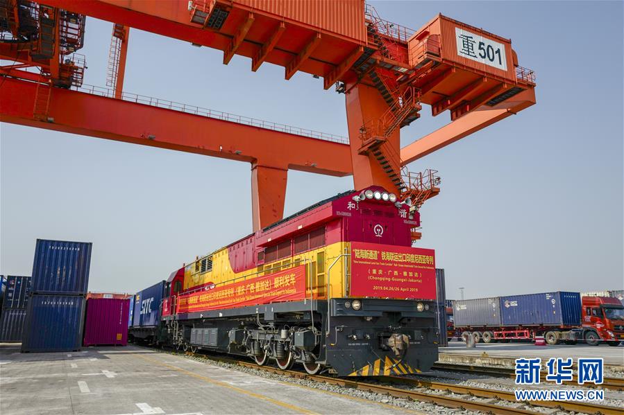 在中鐵聯(lián)集重慶中心站內(nèi),“陸海新通道”鐵海聯(lián)運(yùn)出口印度尼西亞的首趟專列準(zhǔn)備發(fā)車(2019年4月26日攝)。新華社記者 劉潺 攝