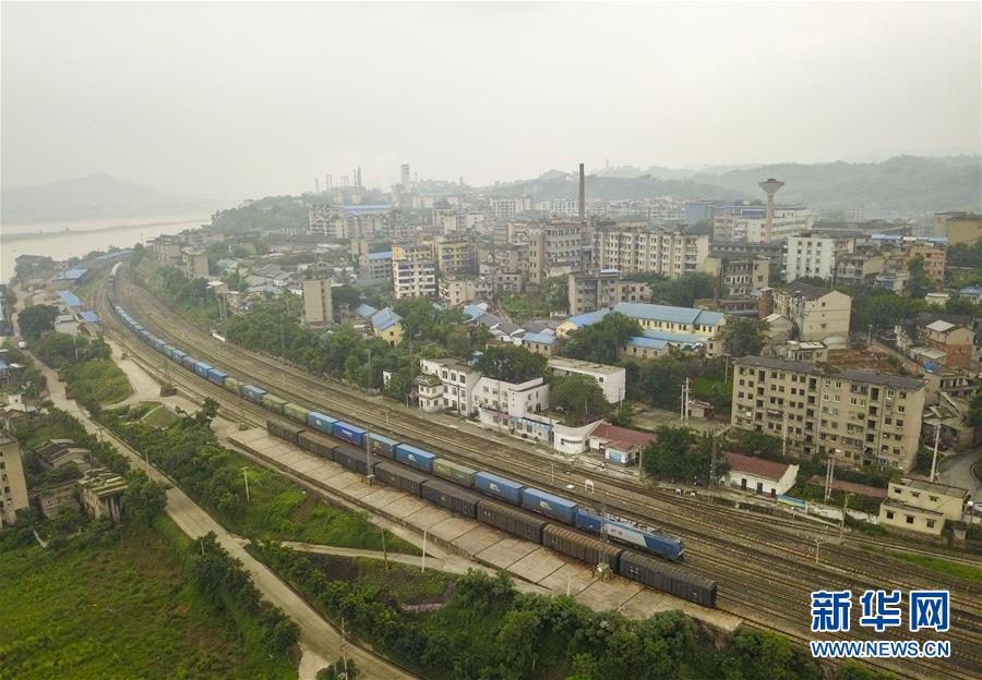 一列貨運(yùn)列車經(jīng)過(guò)成渝鐵路銅罐驛站(2019年6月11日無(wú)人機(jī)拍攝)。新華社記者 劉潺 攝