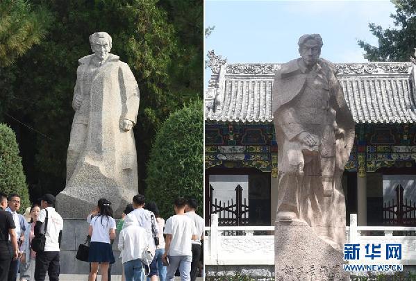 拼版照片左圖為劉志丹烈士陵園內(nèi)的劉志丹雕像(8月8日攝);右圖為子長烈士紀念館內(nèi)的謝子長雕像(8月9日攝)。新華社記者 羅曉光 攝