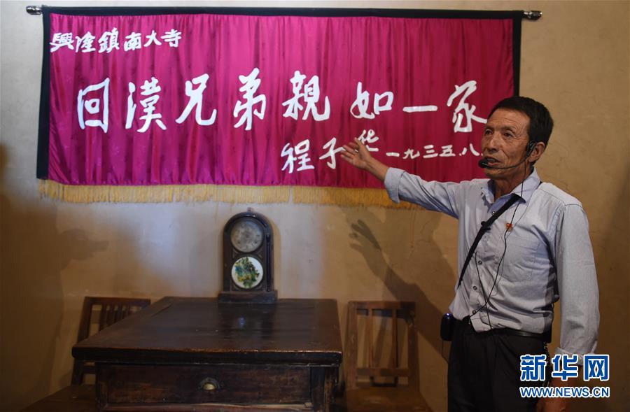在寧夏西吉縣單家集村,西吉縣單南村黨支部書記單云在介紹“回漢兄弟親如一家”的錦匾(復制品)(8月11日攝)。新華社記者 羅曉光 攝