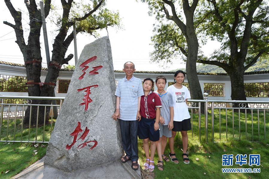 在湖北省石首市桃花山紅軍樹革命烈士紀念園,67歲的守樹人劉克樹在“紅軍樹”前與他的孫輩合影(8月1日攝)。新華社記者 羅曉光 攝
