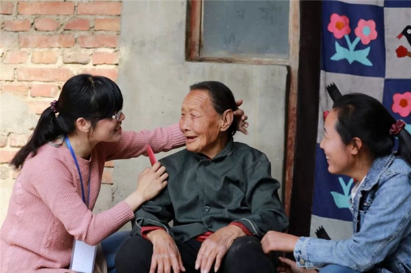 2016年4月11日,河北省邢臺市內丘縣金店鎮韓郝莊村大學生“村官”田少微(左)在和孤寡老人聊天。