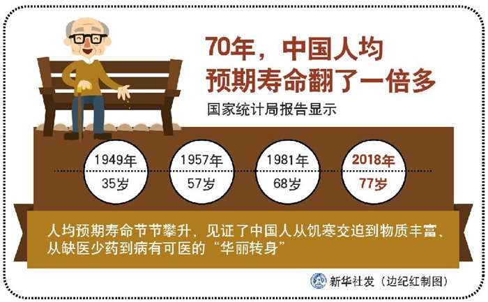 國家統計局報告顯示,1949年35歲,1957年57歲,1981年68歲,2018年77歲——人均預期壽命節節攀升,見證了中國人從饑寒交迫到物質豐富、從缺醫少藥到病有可醫的“華麗轉身”——