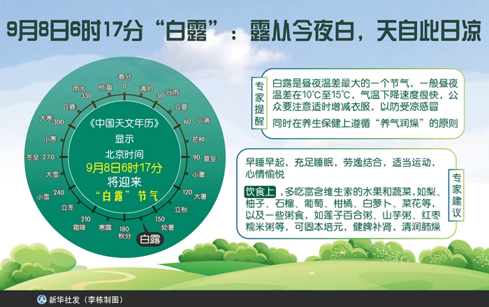 新華社天津9月6日電(記者周潤健)“憑闌久,金波漸轉(zhuǎn),白露點(diǎn)蒼苔。”《中國天文年歷》顯示,北京時間9月8日6時17分將迎來“白露”節(jié)氣。專家提醒說,此時節(jié)“秋老虎”將逝去,氣溫開始下降,天氣逐漸轉(zhuǎn)涼,公眾要注意養(yǎng)氣潤燥。