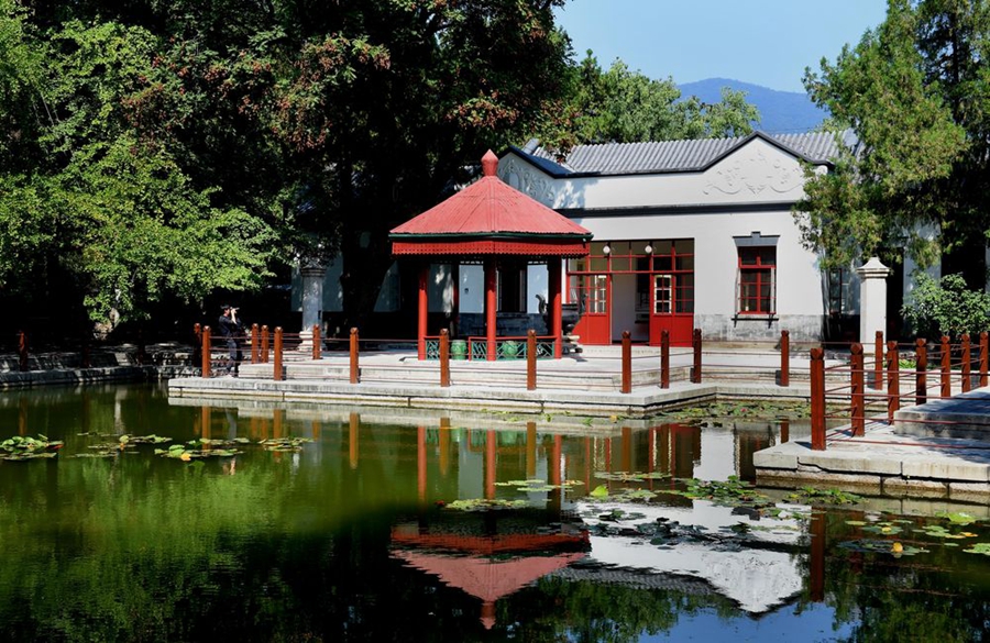 雙清別墅里,簡樸的桌椅家具,墻上的地圖,桌上的紙筆書報,還原著革命勝利前夜,開國領袖在此運籌帷幄、決勝千里的場景;六角紅亭前,當年毛主席坐在木椅上閱讀《進步日報》“南京解放”報道的畫面,如在眼前。
