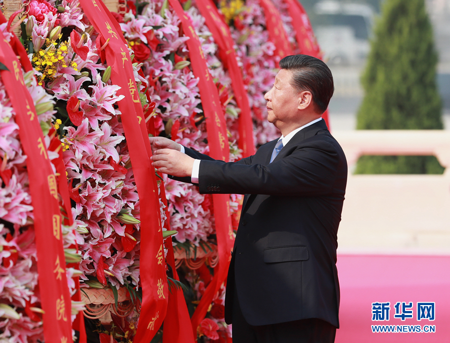 9月30日上午,習(xí)近平、李克強、栗戰(zhàn)書、汪洋、王滬寧、趙樂際、韓正、王岐山等黨和國家領(lǐng)導(dǎo)人來到北京天安門廣場,出席烈士紀(jì)念日向人民英雄敬獻花籃儀式。這是習(xí)近平整理花籃上的緞帶。 新華社記者 龐興雷 攝