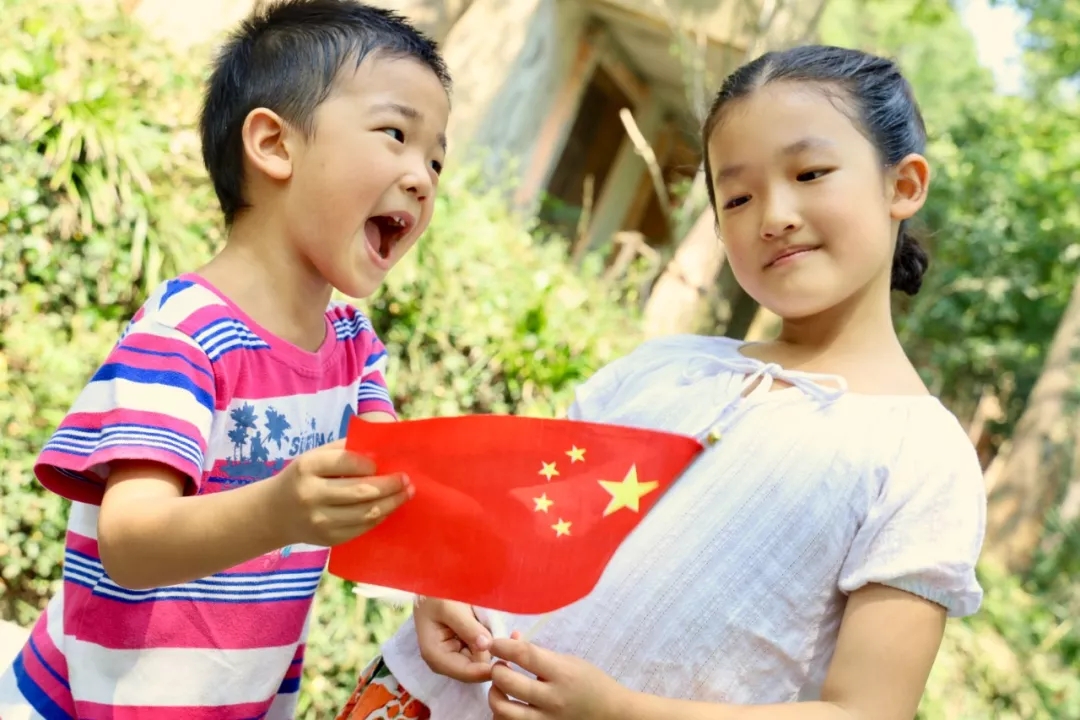 2019年9月28日,甘肅甘谷。幼兒園的小朋友歡快地揮動手中的五星紅旗,祝福祖國生日快樂!作者:草野沐風