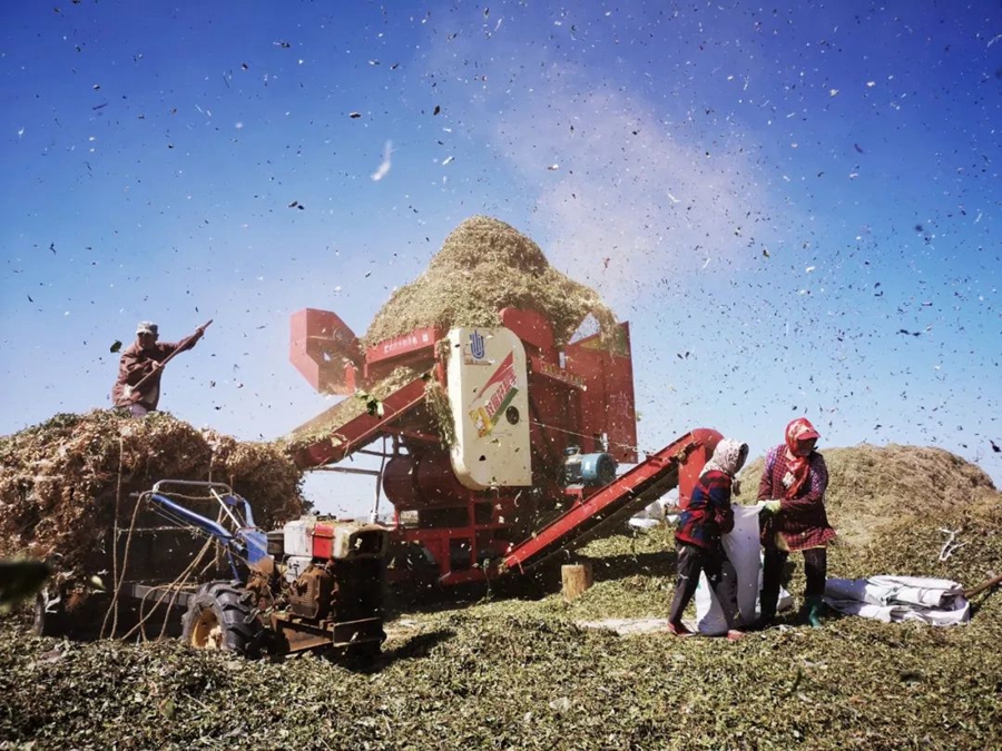 9月22日,山東招遠(yuǎn)。村民正在場(chǎng)院里給豐收的花生脫果。作者:金都海哥