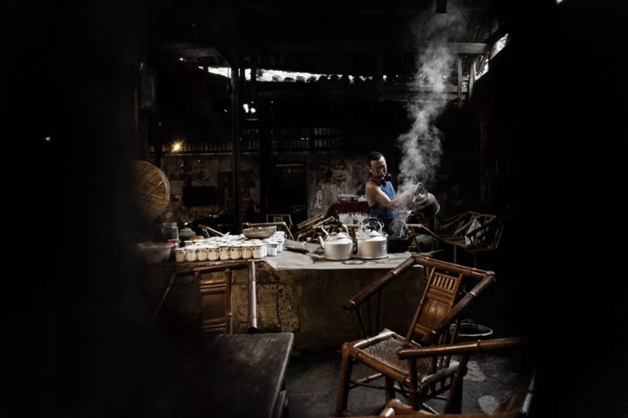 5月17日,四川成都。早晨,茶館工作人員開(kāi)始倒水。作者:王金磊