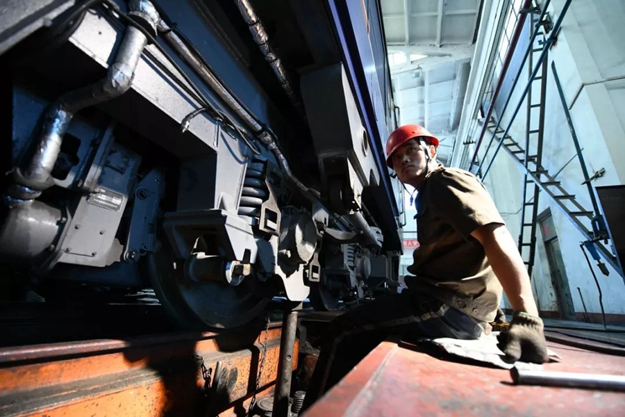 10月2日,內(nèi)蒙古巴林右旗。當(dāng)?shù)罔F路職工為機(jī)車(chē)更換車(chē)輪。作者:這么近那么遠(yuǎn)