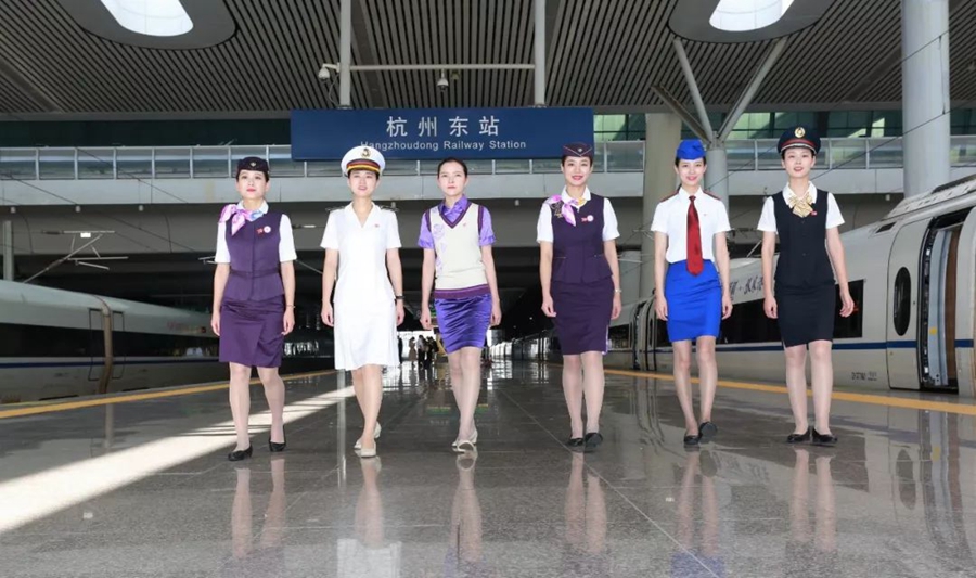 10月2日,浙江杭州。杭州客運(yùn)段列車(chē)員穿上不同的鐵路制服。作者:沈克勤