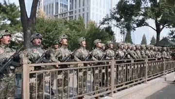 彼時(shí),當(dāng)載有女排隊(duì)員的花車駛過(guò),結(jié)束受閱的官兵們?cè)诼放札R聲喊出“中國(guó)女排,世界第一”。