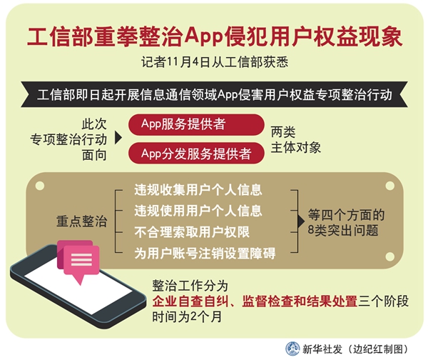 新華社北京11月4日電(記者張辛欣)記者4日從工信部獲悉,工信部即日起開展信息通信領(lǐng)域App侵害用戶權(quán)益專項(xiàng)整治行動(dòng)。對(duì)違規(guī)收集用戶個(gè)人信息、違規(guī)使用用戶個(gè)人信息等8類突出問題重拳整治。