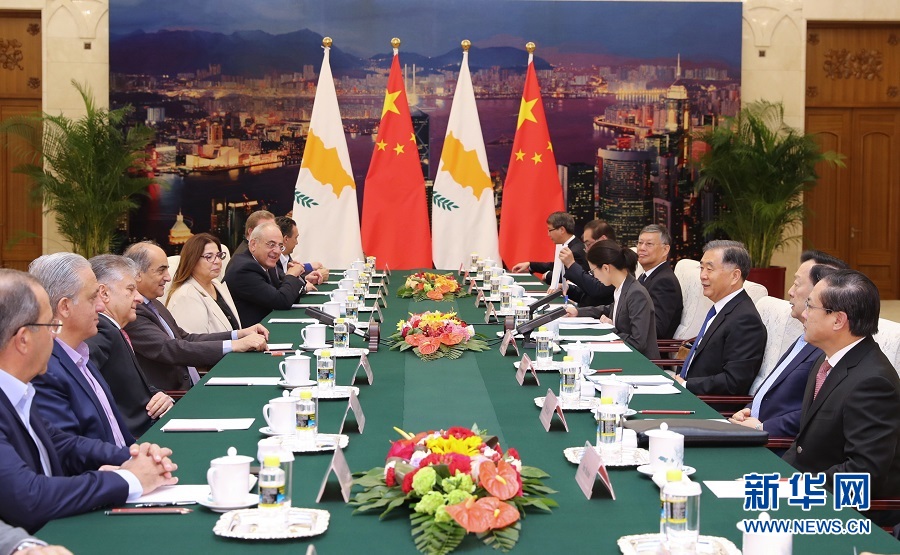 11月8日,全國政協主席汪洋在北京人民大會堂會見塞浦路斯議長西盧里斯。 新華社記者 鞠鵬 攝