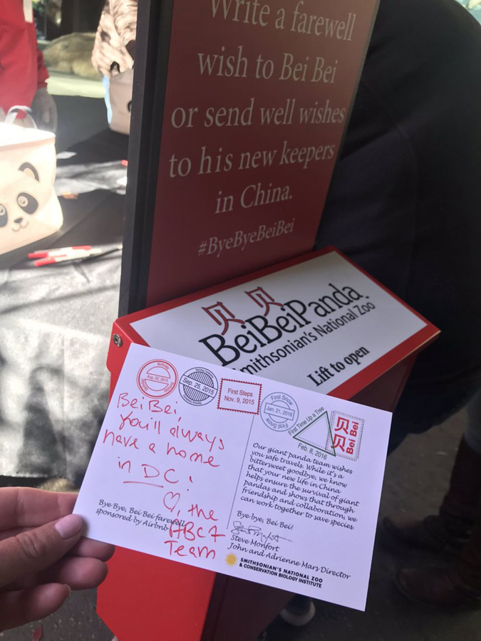 工作人員還在熊貓館外設(shè)立了一處臨時(shí)明信片中心。老老少少都在明信片上寫(xiě)下給“貝貝”的祝福。據(jù)介紹,這些明信片也會(huì)一同送到中國(guó)。