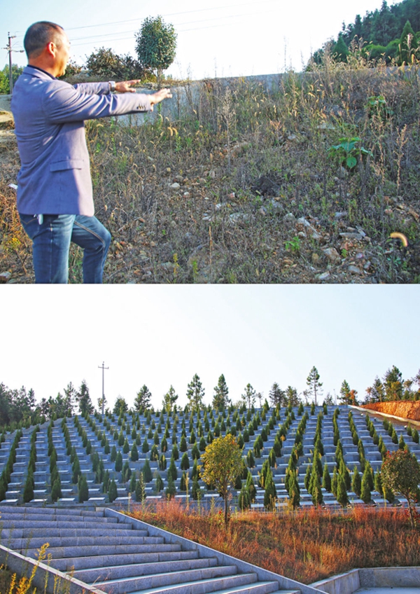 ▲拼版圖片:上圖為湖南平江縣梅仙鎮(zhèn)三里村支書王杏發(fā)在介紹已拆掉的活人墓;下圖為三里村新建公墓(11月15日攝)。新華每日電訊記者 謝銳佳 攝