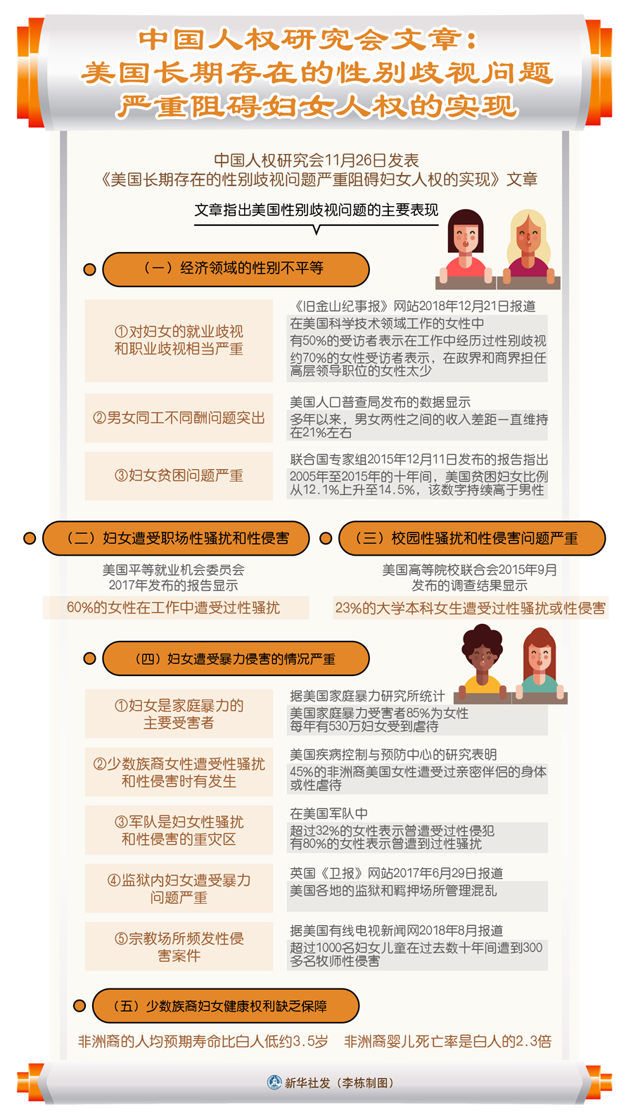 新華社北京11月26日電 中國人權(quán)研究會26日發(fā)表《美國長期存在的性別歧視問題嚴(yán)重阻礙婦女人權(quán)的實(shí)現(xiàn)》文章。全文如下:
