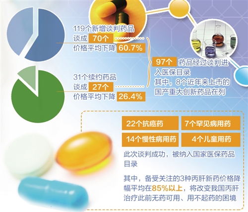 記者了解到,22個抗癌藥、7個罕見病用藥、14個慢性病用藥、4個兒童用藥此次談判成功,被納入國家醫(yī)保藥品目錄。其中,備受關(guān)注的3種丙肝新藥價(jià)格降幅平均在85%以上,將改變我國丙肝治療此前無藥可用、用不起藥的困境。