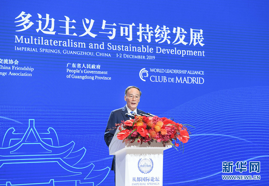 12月1日,國(guó)家副主席王岐山在廣州出席“2019從都國(guó)際論壇”開幕式并致辭。 新華社記者 申宏 攝