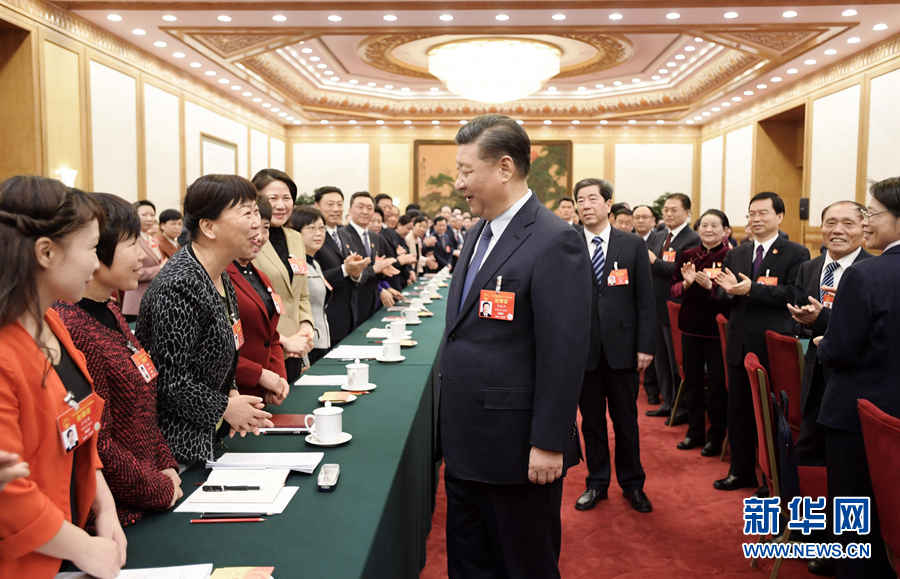 3月8日,中共中央總書(shū)記、國(guó)家主席、中央軍委主席習(xí)近平參加十三屆全國(guó)人大二次會(huì)議河南代表團(tuán)的審議。在“三八”國(guó)際勞動(dòng)?jì)D女節(jié)到來(lái)之際,習(xí)近平代表黨中央,向參加全國(guó)兩會(huì)的女代表、女委員、女工作人員,向全國(guó)各族各界婦女,致以節(jié)日的祝賀和美好的祝福。這是習(xí)近平同女代表親切握手。新華社記者 謝環(huán)馳 攝