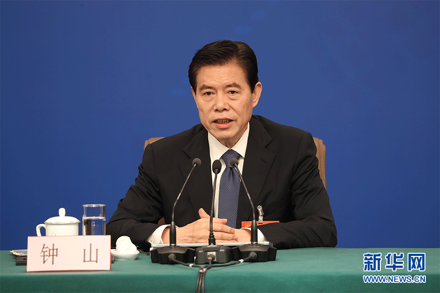 十三屆全國人大二次會議新聞中心3月9日(星期六)10時30分在梅地亞中心新聞發布廳舉行記者會,邀請商務部部長鐘山、副部長兼國際貿易談判副代表王受文、副部長錢克明就“促進形成強大國內市場 推動全方位對外開放”相關問題回答中外記者提問。圖為商務部部長鐘山。新華網/中國政府網 陳杰 攝
