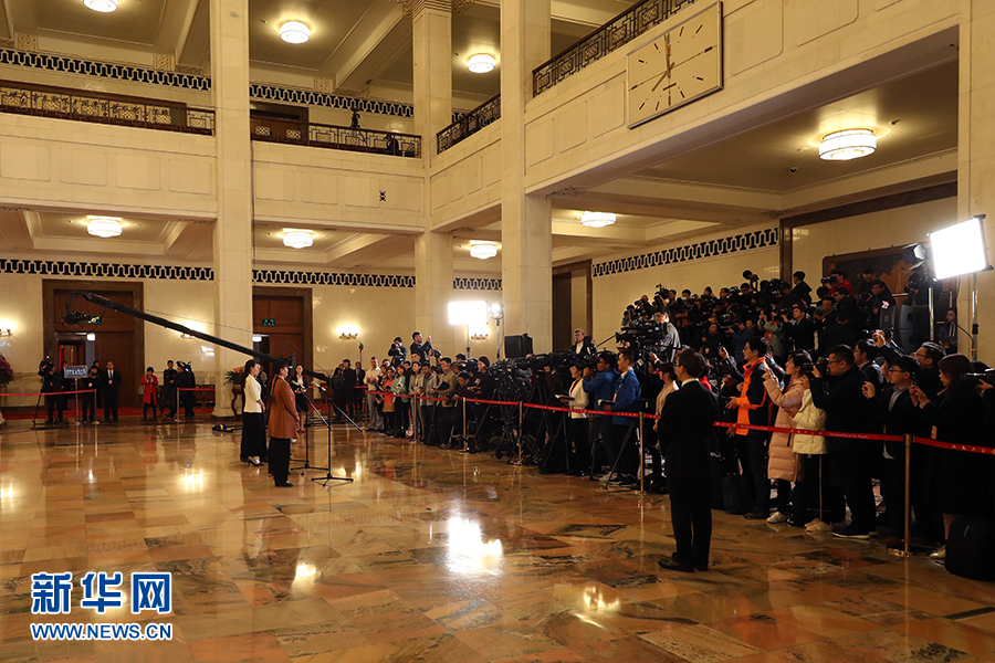 3月15日,十三屆全國人大二次會議在北京人民大會堂舉行閉幕會。圖為全國人大代表在“代表通道”接受采訪。新華網/中國政府網 陳杰 攝