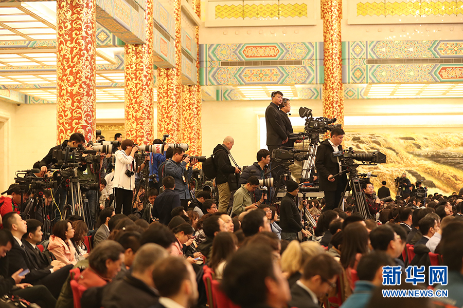 3月15日上午十三屆全國人大二次會議閉幕后,國務(wù)院總理李克強(qiáng)在人民大會堂三樓金色大廳會見采訪十三屆全國人大二次會議的中外記者并回答記者提出的問題。圖為記者在采訪拍攝。新華網(wǎng)/中國政府網(wǎng) 劉廈 攝