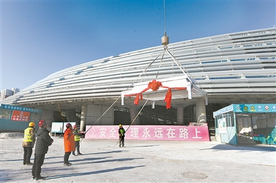 2019年12月31日,施工人員在國家速滑館施工現場起吊最后一塊待安裝的屋面單元板塊。項目建設方有關負責人表示,國家速滑館“冰絲帶”能如期實現“絲帶飛舞”,離不開強有力的監督。新華社記者 鞠煥宗 攝