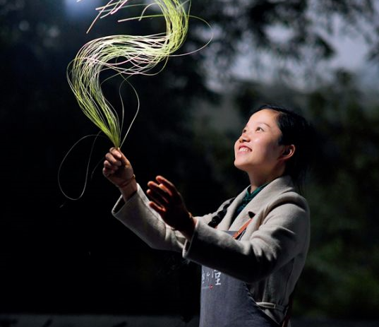 貴州省級非物質(zhì)文化遺產(chǎn)“赤水竹編”傳承人楊昌芹在展示新制作的竹絲(2019 年11 月11 日攝)。赤水市現(xiàn)有竹林面積132.8 萬畝,竹產(chǎn)業(yè)是當(dāng)?shù)剞r(nóng)民增收的重要渠道之一 楊文斌 攝
