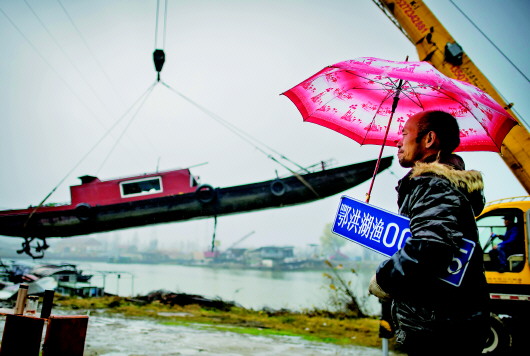 在湖北省洪湖市螺山鎮漁船拆解現場,漁民夏明星注視著被吊起的漁船,眼里泛起淚花。 新華社記者肖藝九攝(資料照片)