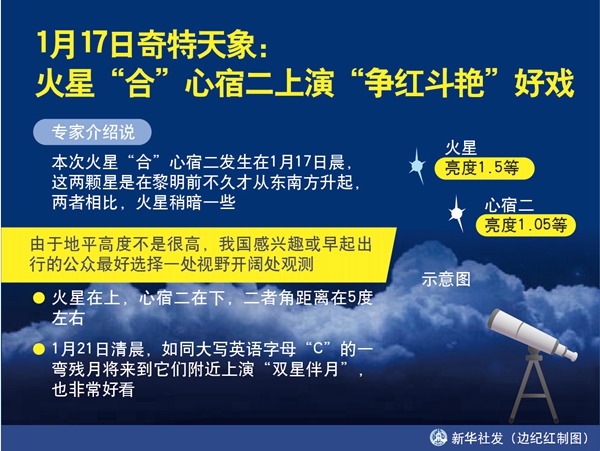“由于地平高度不是很高,我國感興趣或早起出行的公眾最好選擇一處視野開闊處觀測(cè),兩顆泛著紅光的星星還是比較醒目的,火星在上,心宿二在下,二者角距離在5度左右。值得一提的是,1月21日清晨,如同大寫英語字母‘C’的一彎殘?jiān)聦淼剿鼈兏浇涎荨p星伴月’,也非常好看。”趙之珩提醒說。