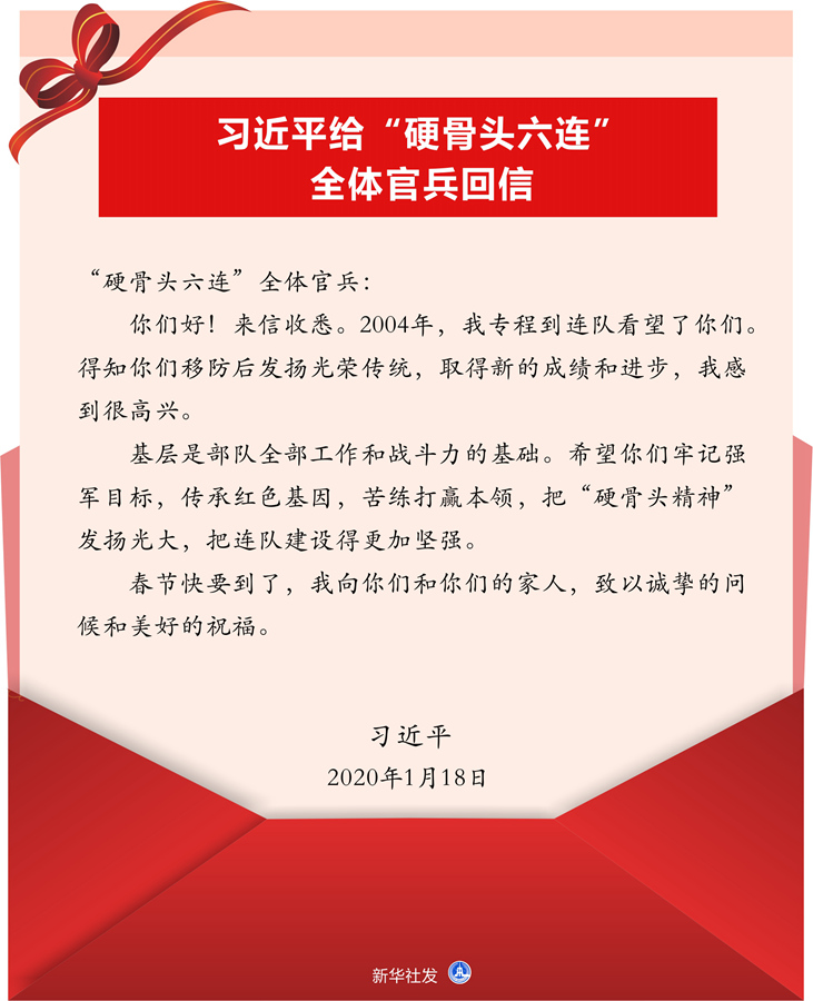 新華社北京1月19日電 中共中央總書記、國家主席、中央軍委主席習近平1月18日給74集團軍某旅“硬骨頭六連”全體官兵回信,勉勵他們牢記強軍目標,傳承紅色基因,苦練打贏本領,把“硬骨頭精神”發揚光大,把連隊建設得更加堅強,并向官兵們和他們的家人致以新春祝福。回信全文如下: