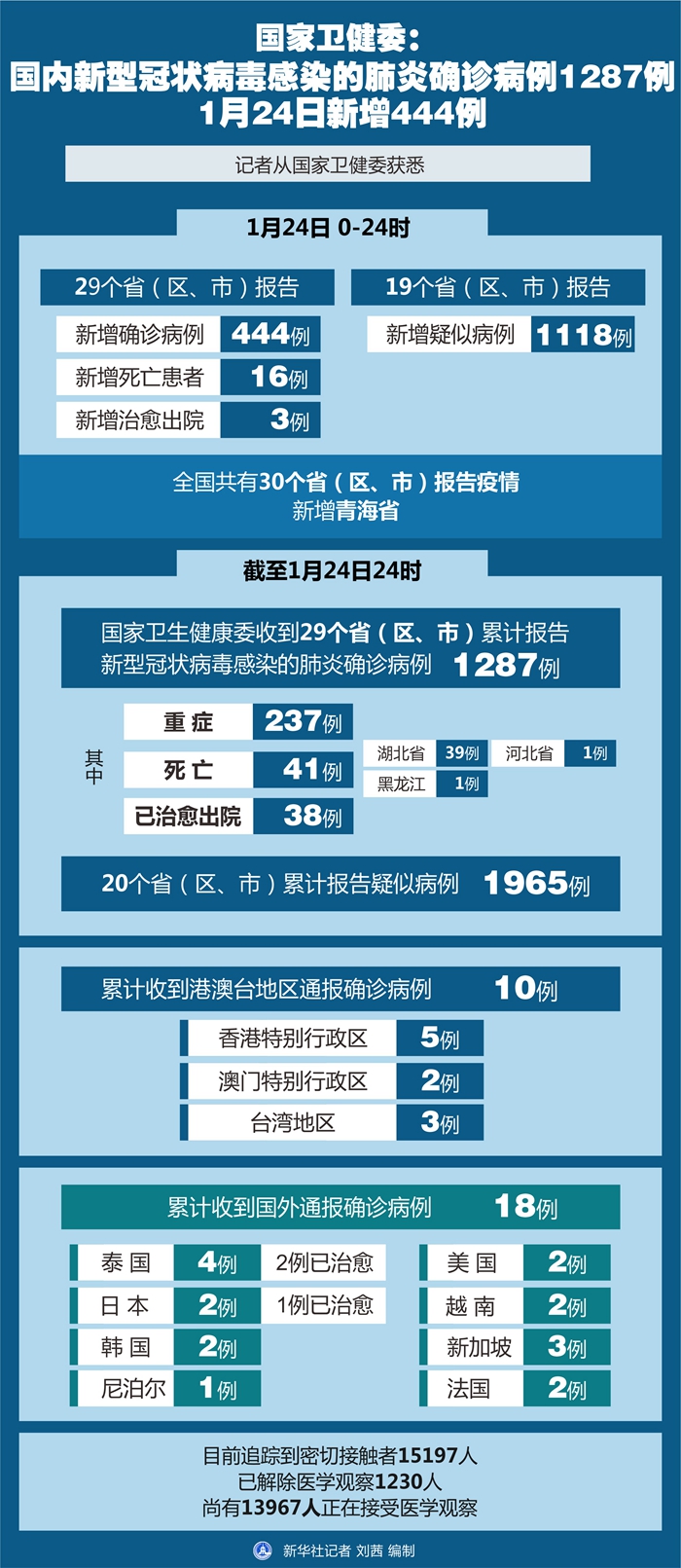 截至1月24日24時,國家衛(wèi)健委收到29個省(區(qū)、市)累計報告新型冠狀病毒感染的肺炎確診病例1287例,其中重癥237例,死亡41例(湖北省39例、河北省1例、黑龍江1例)。已治愈出院38例。20個省(區(qū)、市)累計報告疑似病例1965例。