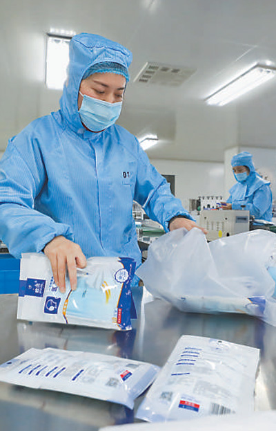 近日,各地口罩生產企業抓緊生產,全力增加市場供應。圖為浙江省德清縣一家口罩企業生產車間,工作人員在包裝口罩。王正 王玨攝影報道(影像中國)