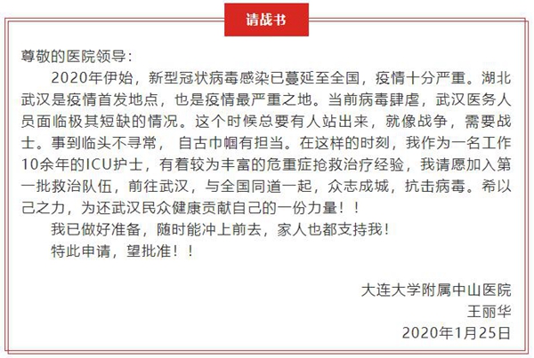 通知下發后,大連各大醫院醫護人員紛紛主動請纓:“只要被需要,義無反顧,放心吧主任,我強壯”“主任,我也可以去武漢,等待您的派遣”“一切聽從組織安排”“需要我們的時候到了,沒有硝煙的戰場需要我們,我自愿加入抗擊疫情的隊伍”……醫院微信群里被自愿報名聲刷屏。