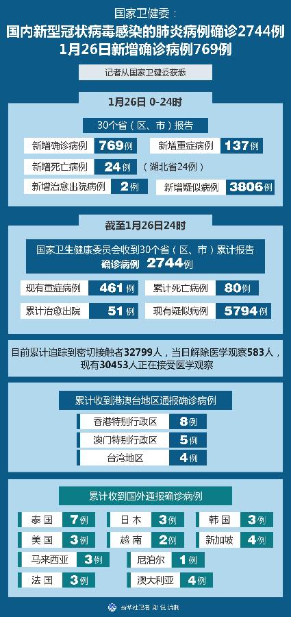 截至1月26日24時,國家衛生健康委員會收到30個省(區、市)累計報告確診病例2744例,現有重癥病例461例,累計死亡病例80例,累計治愈出院51例。現有疑似病例5794例。