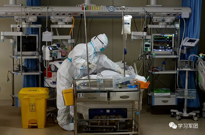 1月27日上午,海軍軍醫(yī)大學(xué)醫(yī)療隊(duì)醫(yī)護(hù)人員在漢口醫(yī)院重癥監(jiān)護(hù)室對新型冠狀病毒感染的肺炎患者進(jìn)行救治。醫(yī)護(hù)人員密切關(guān)注患者病情,根據(jù)變化調(diào)整輸液速度。解放軍報(bào)記者范顯海攝