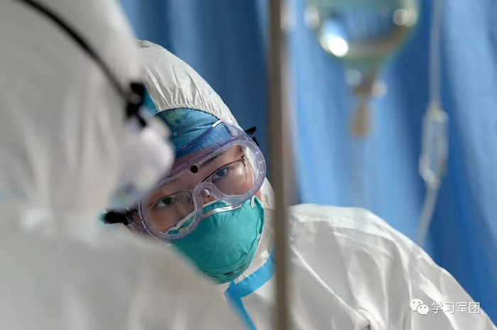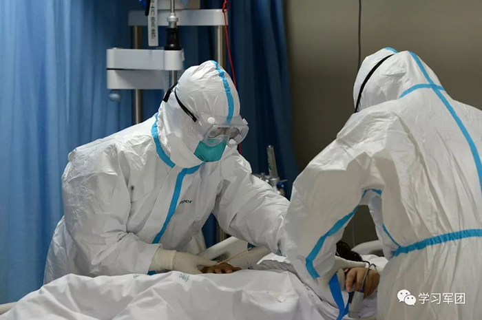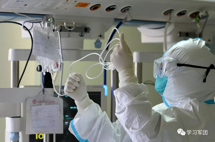 1月27日上午,海軍軍醫(yī)大學(xué)醫(yī)療隊(duì)醫(yī)護(hù)人員在漢口醫(yī)院重癥監(jiān)護(hù)室對新型冠狀病毒感染的肺炎患者進(jìn)行救治。醫(yī)護(hù)人員查看患者輸液導(dǎo)管是否通暢。解放軍報(bào)記者范顯海攝