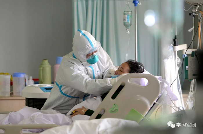 1月27日上午,海軍軍醫(yī)大學(xué)醫(yī)療隊(duì)醫(yī)護(hù)人員在漢口醫(yī)院重癥監(jiān)護(hù)室對新型冠狀病毒感染的肺炎患者進(jìn)行救治。醫(yī)護(hù)人員耐心安撫患者。解放軍報(bào)記者范顯海攝