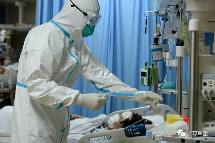 1月27日上午,海軍軍醫(yī)大學(xué)醫(yī)療隊(duì)醫(yī)護(hù)人員在漢口醫(yī)院重癥監(jiān)護(hù)室對新型冠狀病毒感染的肺炎患者進(jìn)行救治。醫(yī)護(hù)人員對患者進(jìn)行輸液護(hù)理。解放軍報(bào)記者范顯海攝