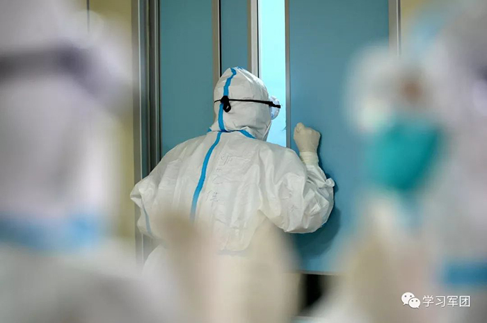 1月27日上午,海軍軍醫(yī)大學(xué)醫(yī)療隊(duì)醫(yī)護(hù)人員在漢口醫(yī)院重癥監(jiān)護(hù)室對新型冠狀病毒感染的肺炎患者進(jìn)行救治。醫(yī)護(hù)人員與監(jiān)護(hù)室外人員隔門交流。解放軍報(bào)記者范顯海攝