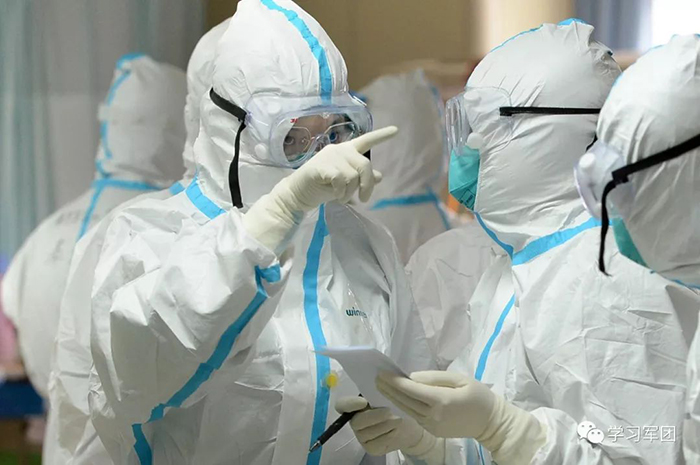 1月27日上午,海軍軍醫(yī)大學(xué)醫(yī)療隊(duì)醫(yī)護(hù)人員在漢口醫(yī)院重癥監(jiān)護(hù)室對新型冠狀病毒感染的肺炎患者進(jìn)行救治。醫(yī)護(hù)人員研究重癥患者治療方案。解放軍報(bào)記者范顯海攝