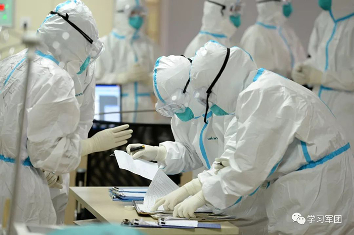 1月27日上午,海軍軍醫(yī)大學(xué)醫(yī)療隊(duì)醫(yī)護(hù)人員在漢口醫(yī)院重癥監(jiān)護(hù)室對新型冠狀病毒感染的肺炎患者進(jìn)行救治。醫(yī)護(hù)人員認(rèn)真記錄醫(yī)療文書,執(zhí)行醫(yī)囑。解放軍報(bào)記者范顯海攝