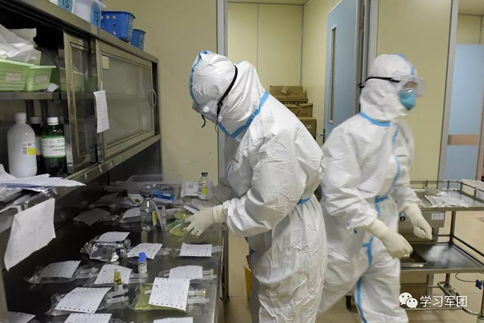 1月27日上午,海軍軍醫(yī)大學(xué)醫(yī)療隊(duì)醫(yī)護(hù)人員在漢口醫(yī)院重癥監(jiān)護(hù)室對新型冠狀病毒感染的肺炎患者進(jìn)行救治。醫(yī)護(hù)人員配備藥品。解放軍報(bào)記者范顯海攝