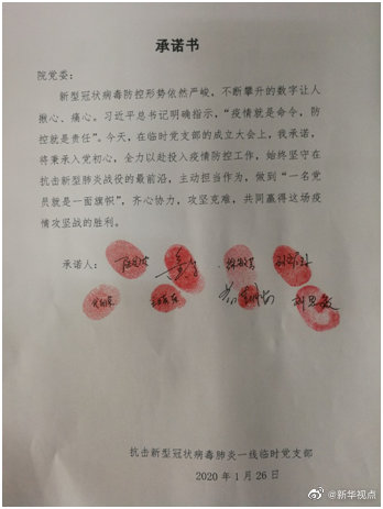 “我承諾,將秉承入黨初心,全力以赴投入疫情防控工作……”應(yīng)對疫情,湖北省中醫(yī)院新型冠狀病毒肺炎抗擊一線臨時黨支部成立。黨支部成員由感染科、肺病科、ICU、檢驗科等醫(yī)、技、藥、護、行政、后勤等科室的66名黨員構(gòu)成。多名臨時黨支部成員還簽下承諾書,表示將主動擔(dān)當(dāng)作為,做到“一名黨員就是一面旗幟”。(記者 梁建強)