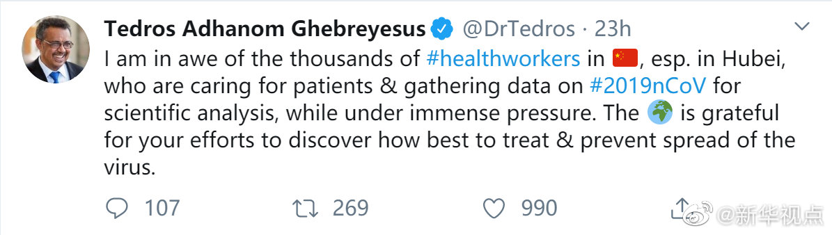 世界衛生組織總干事譚德塞9日通過社交媒體,向抗擊新冠肺炎疫情的中國醫護人員致敬?!拔蚁蛟谥袊尼t護人員、特別是在湖北省的醫護人員致敬。他們在巨大壓力之下,不僅在照顧(新冠肺炎)患者,還在為針對新冠病毒的科學分析搜集數據。全世界感激你們為找到最好的治療辦法和防止病毒蔓延所作的努力?!保ㄓ浾吡柢?劉曲)