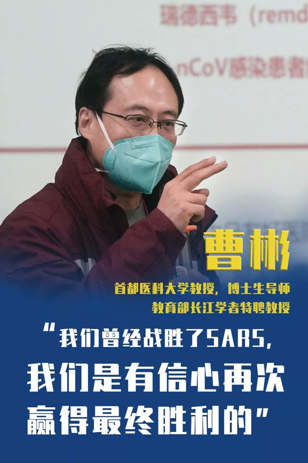 首都醫(yī)科大學(xué)教授、博士生導(dǎo)師,教育部長江學(xué)者特聘教授,中日友好醫(yī)院副院長曹彬在疫情暴發(fā)前期就作為衛(wèi)健委特派專家多次奔赴武漢一線。當(dāng)他得知自己所屬的中日友好醫(yī)院將召集醫(yī)療隊(duì)共赴戰(zhàn)場時(shí),他在呼吸中心的微信群里發(fā)了這樣的信息:“我在武漢等你”。受他感召,中日友好醫(yī)院呼吸中心的同事們紛紛踴躍報(bào)名!